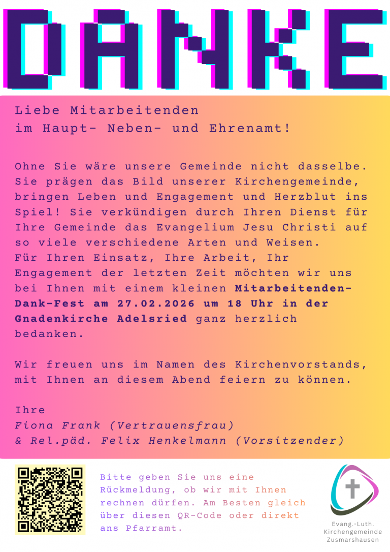 Herzlich Willkommen auf der Homepage unserer Kirchengemeinde! Aktuelles Gottesdienst zum Valentinstag Weiterlesen Einladung zum Mitarbeitenden-Dank, 27.02. Weiterlesen „Miteinander am Nachmittag“ im Februar Weiterlesen Jahresspende – Ihr Beitrag für die Gemeinde Weiterlesen Kinderaktion “Komm, spiel mit!” Weiterlesen Gottesdienst on Tour – Reisesegen in der Autobahnkirche Weiterlesen Gottesdienst on Tour – Gottesdienst im Grünen Weiterlesen Ökumen. Valentins-Gottesdienst, 16.02. Weiterlesen Abschied von Diakon Matthias Schrank (Bericht) Weiterlesen Vertrauenspersonen des KV gewählt Weiterlesen Prüft alles und behaltet das Gute – Jahreslosung 2025 Weiterlesen Diakon Schrank verabschiedet sich Weiterlesen Seniorenkino, 24.01. Weiterlesen Pressemitteilung – Ergebnis der Kirchenvorstandswahl Weiterlesen Informationen zur personellen Situation Weiterlesen Alle Beiträge anzeigen Nächste Gottesdienste Alle Veranstaltungen anzeigen