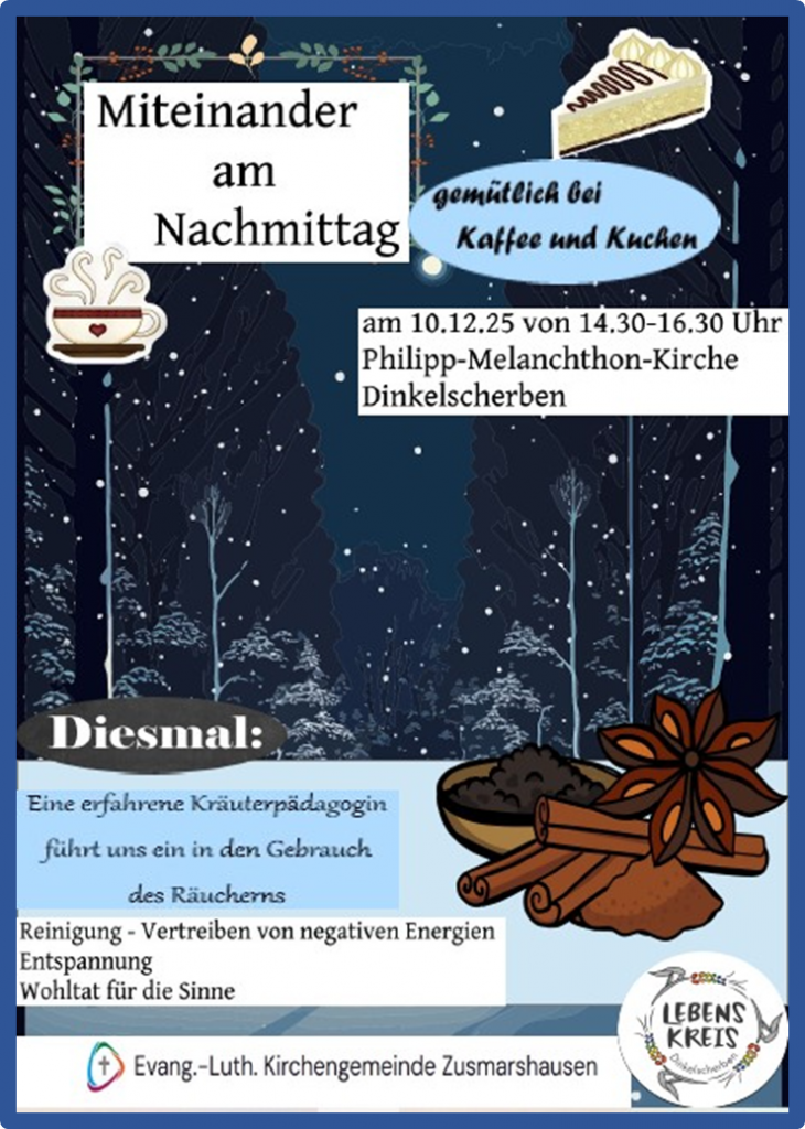 Vor einem Jahr haben wir das Seniorenkreis-Team in Dinkelscherben verabschiedet. Lange hat sich niemand gefunden, der diesen Kreis weiter organisieren wollte. Doch nun wird es wieder ein Angebot für Senior*innen in der Philipp-Melanchthon-Kirche in Dinkelscherben geben. Dabei ist der „Lebenskreis Dinkelscherben e.V.“ als Kooperationspartner mit im Boot. Der Lebenskreis plant und organisiert die Termine, lädt ein und führt sie auch durch; wir als Kirchengemeinde stellen dafür die Räumlichkeiten zur Verfügung. Und Sie profitieren davon. Mit einem neuen Namen und einem neuen Team gibt es jetzt wieder ein Angebot für Sie. Fühlen Sie sich ganz herzlich eingeladen zum ersten Treffen am 10.12.